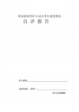 国家级绿色矿山试点单位建设情况自评报告矿山名称:法定代表人(签字):(矿山企业盖章)一、基本情况自绿色矿山试点单位申请以来,公司从依法办矿、规范管理、资源综合利用、技术创新、节能减排、环境保护、土地复垦、社区和谐、企业文化等九个方面全面贯彻落实绿色矿山的目标。我公司始终坚持以科学发展观为指导,釆用先进的科技手段,实施严格的科学管理,以清洁生产、节能减排、资源综合利用、循环经济等生产模式,实现资源充分合理利用、保护环境、安全生产、社区和谐和矿业经济的可持续发展。我公司是一家注册资本208万元的中小型矿山企业,允许开采标高范围为160m标高至-100m标高以上,经营范围为:锌矿、铜矿、铅矿、硫铁矿...