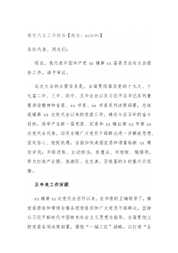 镇党代会工作报告【微信:mydr91】各位代表、同志们:现在,我代表中国共产党xx镇第xx届委员会向大会报告工作,请予审议。这次大会的主要任务是,全面贯彻落实党的十九大、十九届二中、三中、四中、五中全会以及习近平总书记系列重要讲话精神和省委、xx市委、xx市委系列决策部署,总结我镇第xx次党代会以来的党委工作,确定今后五年的奋斗目标,选举产生新一届党委、纪委和xx镇出席xx市第xx次党代会代表,动员全镇广大党员干部群众进一步解放思想、坚定信心、抢抓机遇,全面加快美丽宜居和谐富裕新xx建设步伐;开拓进取、主动担当,抓重点、补短板、强弱项,努力打造产业强、旅游旺、生态美、百姓富的乡村振兴示范镇。五...
