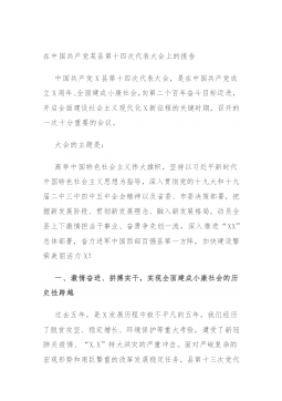 在中国共产党某县第十四次代表大会上的报告中国共产党X县第十四次代表大会,是在中国共产党成立X周年、全面建成小康社会,向第二个百年奋斗目标迈进,开启全面建设社会主义现代化X新征程的关键时期,召开的一次十分重要的会议。大会的主题是:高举中国特色社会主义伟大旗帜,坚持以习近平新时代中国特色社会主义思想为指导,深入贯彻党的十九大和十九届二中三中四中五中全会精神以及省委、市委决策部署,把握新发展阶段、贯彻新发展理念、融入新发展格局,动员全县上下激情担当干事业、奋勇争先创一流,深入推进“XX”总体部署,奋力进军中国西部百强县第一方阵,加快建设繁荣美丽活力X!一、激情奋进、拼搏实干,实现全面建成小康社会的历...