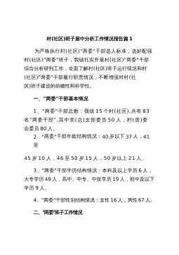 村(社区)班子届中分析工作情况报告篇1为严格执行村(社区)"两委"干部选人标准,选好配强村(社区)"两委"班子,我镇扎实开展村(社区)"两委"干部综合分析研判工作,全面了解村(社区)班子运行情况和村(社区)"两委"干部履行职责情况,不断增强对村(社区)班子建设的前瞻性和科学性。一、"两委"干部基本情况1、"两委"干部总数:我镇15个村(社区),共有83名"两委干部",其中党(总)支部委员50人,村(居)委会委员80人。2、"两委"干部年龄结构情况:40岁以下37人,41至45岁10人,46至50岁15人,50岁以上21人。3、"两委"干部学历结构情况:本科及以上学历6人,大专学历49人,高中、...
