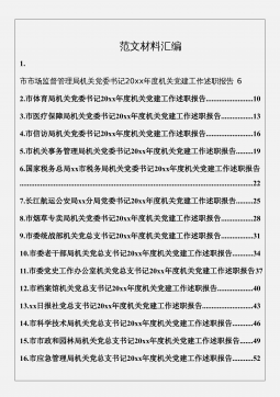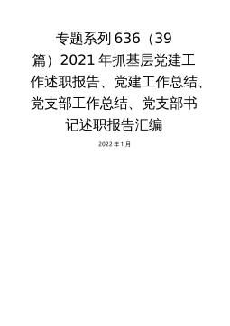 专题系列636(39篇)2021年抓基层党建工作述职报告、党建工作总结、党支部工作总结、党支部书记述职报告汇编2022年1月目录1.江西省委党校副校长廖清成:抓基层党建工作述职报告⋯⋯⋯⋯⋯⋯⋯⋯⋯12.刘章烈:办公室研究室党支部党建工作述职报告⋯⋯⋯⋯⋯⋯⋯⋯⋯⋯⋯⋯53.潘泽林:组织人事处党支部党建工作述职报告⋯⋯⋯⋯⋯⋯⋯⋯⋯⋯⋯⋯⋯74.徐祖荣:科研管理部党支部党建工作述职报告⋯⋯⋯⋯⋯⋯⋯⋯⋯⋯⋯⋯115.侯巧宝:干部培训处党支部党建工作述职报告⋯⋯⋯⋯⋯⋯⋯⋯⋯⋯⋯⋯186.龚时嵘:党校(行政学院)工作处党支部党建工作述职报告⋯⋯⋯⋯⋯⋯⋯217.李发安:保卫处党支部党建工作述职⋯...