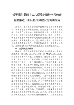 关于深入贯彻中央八项规定精神学习教育全面推进干部队伍作风建设的调研报告近年来,在习近平新时代中国特色社会主义思想指引下,我市紧跟全省的发展步伐,大力实施“大开放、大改革、大招商”的主战略,积极推进城市化、工业化和农业产业化,全市经济出现良好的发展势头。在这一过程中,市委坚持把干部的思想作风建设作为党的建设的中啊哟任务来抓,用发展凝聚人心,凭实绩选人用人,在干部中大力弘扬求真务实的风气、开拓进取的风气、民主团结的风气,为实现XX经济超常规发展提供了坚强的组织保证。一、主要做法及成效两年来,我们坚持用习近平新时代中国特色社会主义思想武装干部头脑,深入广泛开展了以“XX”大讨论活动,在全市干部中深入开展了主题教育、党纪学习教育,创新开展“两问三视四比”教育活动,干部的思想作风建设取得了较好的成效:...