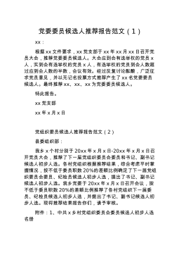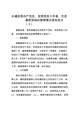 乡镇优秀共产党员、优秀党务工作者、先进基层党组织推荐情况报告范文(1)根据安排,现将我镇全区优秀共产党员、优秀党务工作者、先进基层党组织的推荐情况汇报如下:一、高度重视我镇接到中共xx市X区委组织部《关于推荐评选全市和全区优秀共产党员、优秀党务工作者和先进基层党组织的通知》后,镇党委高度重视,立即召开了党委会,对推荐工作进行了专题研究,落实了由党委副书记xx同志专门负责此项工作,并召开了各党支部书记会议,对推荐名额、推荐对象、推荐评选条件进行了说明,各党支部书记负责本支部的推荐工作,确保推荐工作有条不紊、优中选优。二、公开推荐我们采取自下而上、上下结合、民主公开的方式开展推荐工作。镇党委把推荐...