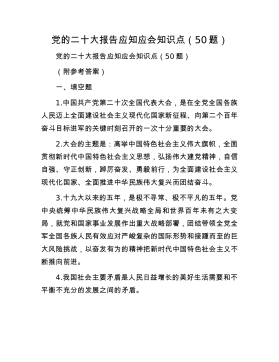 党的二十大报告应知应会知识点(50题)党的二十大报告应知应会知识点(50题)(附参考答案)一、填空题1.中国共产党第二十次全国代表大会,是在全党全国各族人民迈上全面建设社会主义现代化国家新征程、向第二个百年奋斗目标进军的关键时刻召开的一次十分重要的大会。2.大会的主题是:高举中国特色社会主义伟大旗帜,全面贯彻新时代中国特色社会主义思想,弘扬伟大建党精神,自信自强、守正创新,踔厉奋发、勇毅前行,为全面建设社会主义现代化国家、全面推进中华民族伟大复兴而团结奋斗。3.十九大以来的五年,是极不寻常、极不平凡的五年。党中央统筹中华民族伟大复兴战略全局和世界百年未有之大变局,就党和国家事业发展作出重大战略...
