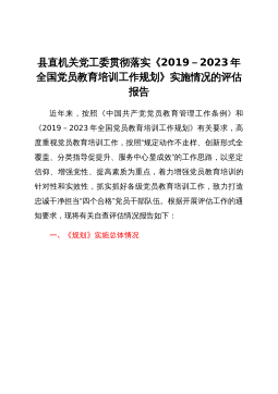 县直机关党工委贯彻落实《2019-2023年全国党员教育培训工作规划》实施情况的评估报告近年来,按照《中国共产党党员教育管理工作条例》和《2019-2023年全国党员教育培训工作规划》有关要求,高度重视党员教育培训工作,按照“规定动作不走样、创新形式全覆盖、分类指导促提升、服务中心显成效”的工作思路,以坚定信仰、增强党性、提高素质为重点,着力增强党员教育培训的针对性和实效性,抓实抓好各级党员教育培训工作,致力打造忠诚干净担当“四个合格”党员干部队伍。根据开展评估工作的通知要求,现将有关自查评估情况报告如下:一、《规划》实施总体情况党工委目前共有基层党组织××个,其中党委××个,党总支××个,党...