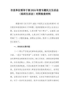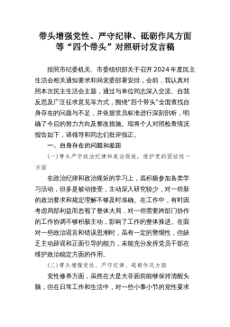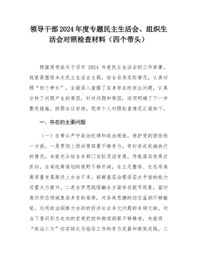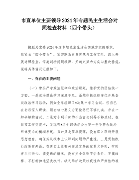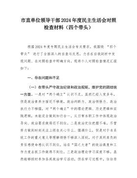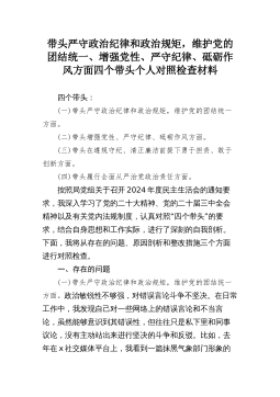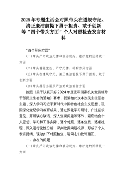2025年专题生活会对照带头在遵规守纪、清正廉洁前提下勇于担责、敢于创新等“四个带头方面”个人对照检查发言材料“”四个带头方面(一)带头严守政治纪律和政治规矩,维护党的团结统一方面(二)带头增强党性、严守纪律、砥砺作风方面(三)带头在遵规守纪、清正廉洁前提下勇于担责、敢于创新方面(四)带头履行全面从严治党政治责任方面按照《关于认真开好2024年度党和国家机关党员领导干部民主生会的通知》要求,我紧扣此次本次民主生活会主题,深入学习习近平新时代中国特色社会主义思想,巩固深化党纪学习教育成果,通过深化学习研讨、广泛征求意见、开展谈心谈话、深入查摆问题等环节,紧密结合个人思想、学习和工作实际,逐个对照...