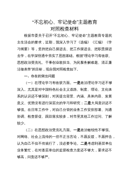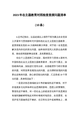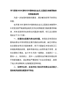 学习贯彻XXX新时代中国特色社会主义思想主体教育集体对照检查材料为进一步加强村级组织建设,逐步解决好班子的突出问题。在开展XXX新时代中国特色社会主义思想主体教育中,X村党支部严格按照县相关文件在对照检查方面的要求和标准,对本支部所存在的突出问题进行梳理。经汇总主要表现在以下几个方面:一、交通安全是最为突出的问题。表现在没有系统全面地在群众中宣传普及交通方面的法律法规,缺乏对群众在交通安全常识方面的教育,班子方面缺乏对安全防卫工作细致周密的排查。最终导致对拉人农用车疏于管理,发生交通伤亡事故。如X年6月的一场事故,当场死亡一人,重伤一人,轻伤四人,其中一人的重伤治疗帐目到现在得不到赔偿解决。该...
