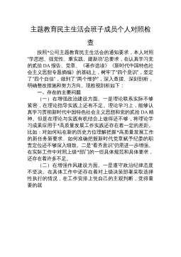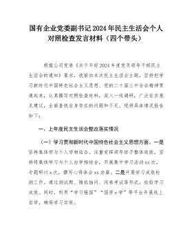 国有企业党委副书记2024年民主生活会个人对照检查发言材料(四个带头)根据公司党委《关于开好2024年度党员领导干部民主生活会的通知》要求,我紧扣本次民主生活会主题,坚持把学习新时代中国特色社会主义思想、党的二十届三中全会精神贯通起来,认真撰写对照检查材料,深入一线调研,广泛征求意见建议,全面查找自身存在的问题和不足。现将具体情况报告如下:一、上年度民主生活会整改落实情况(一)学习贯彻新时代中国特色社会主义思想方面。一是坚持集体学与个人学相结合。注重发挥领导班子整体效能,坚持将集体学习与个人自学相结合,开展集中学习活动xx次,专题研讨x次,撰写心得体会xx余篇。二是开展学习成效检测工作。通过测...