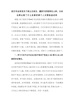 某区司法局党员干部立足岗位、履职尽责做得怎么样,为身边群众做了什么实事好事个人对照检查材料根据《关于组织开展**区司法局党史教育专题组织生活会》的要求和部署,我按照规定动作,在巩固学习习近平总书记在庆祝中国共产党成立100周年大会上的重要讲话、习近平新时代中国特色社会主义思想等理论思想的基础上,系统学习了党史、新中国史、改革开放史、社会主义发展史,始终坚持问题导向,强化党史教育,结合司法工作实际,聚焦“学党史、悟思想、办实事、开新局”专题组织生活会的主题和“学史明理、学史增信、学史崇德、学史力行的目标,认真对照四个方面,认真开展自查,查找问题短板、剖析问题根源,制定整改措施,明确了今后的工作方...