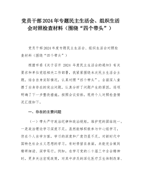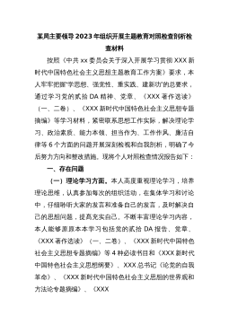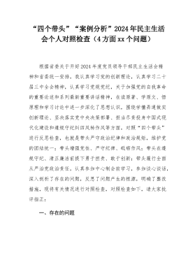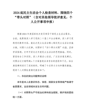 2023“”年全面围绕六个方面组织生活会个人对照检查材料1.深刻领悟"两个确立"的决定性意义、坚决做到"两个维护"方面2.学懂弄通做实领袖新时代中国特色社会主义思想方面3.牢记国之大者、对党忠诚、为党分忧、为党尽责、为党奉献,4.坚持人民至上、解决群众急难愁盼问题方面5.发扬斗争精神、勇于担当作为方面6.克服形式主义、官僚主义方面【正文】作为XX“”人大机关一名党员干部,自己能牢固树立四个意识、坚定"四个自信",做到"两个维护",能够始终同以领袖同志为核心的党中央保持高度一致,但对照党中央和领袖总书记的号召和要求,个人还有很多问题和不足。“”一是对两个确立的内涵领悟不够。对"两”个确立丰富的内...