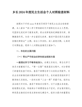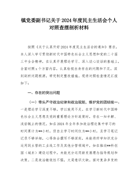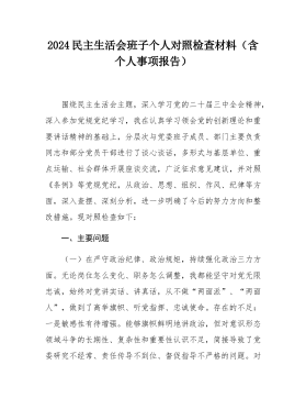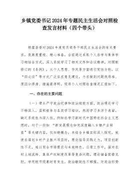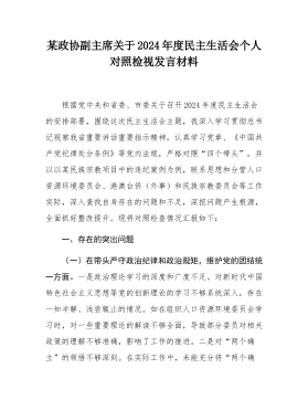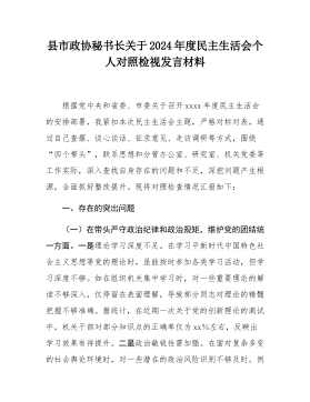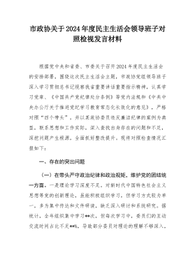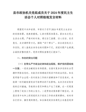 县市政协机关党组成员关于2024年度民主生活会个人对照检视发言材料根据党中央和省委、市委关于召开2024年度民主生活会的安排部署,我高度重视,认真对照具体要求,紧扣本次民主生活会主题,严格对标对表,通过自己查摆、谈心谈话、征求意见、走访调研等方式,围绕“四个带头”,结合政协机关工作实际,深入查找自身存在的问题和不足,深挖问题产生根源,全面抓好整改提升。现将对照检查情况汇报如下:一、存在的突出问题(一)在带头严守政治纪律和政治规矩,维护党的团结统一方面。一是政治敏锐性有待提高。在面对复杂多变的社会思潮和网络信息时,未能及时准确地识别其中的政治风险。如在某网络平台出现一些对政协工作的片面解读和不实...