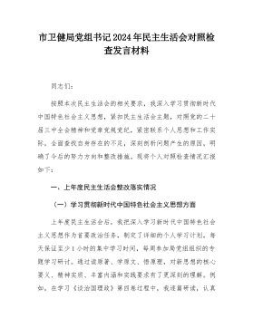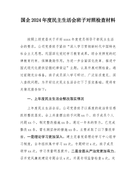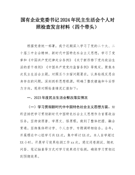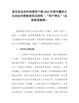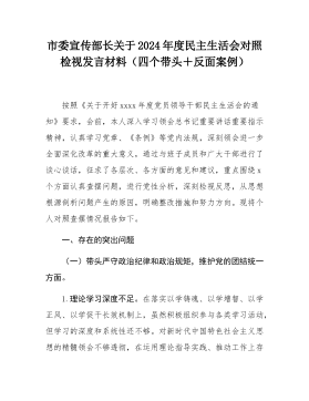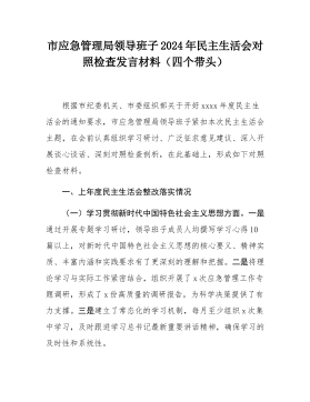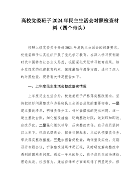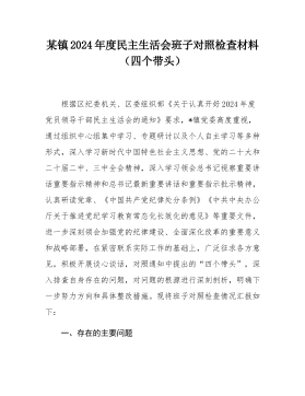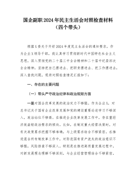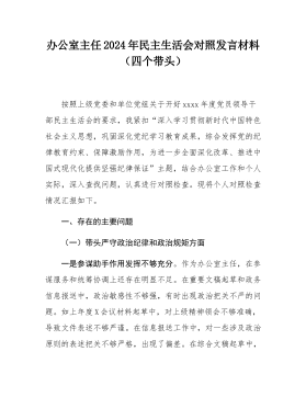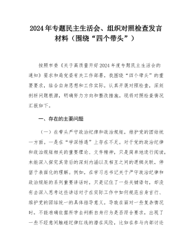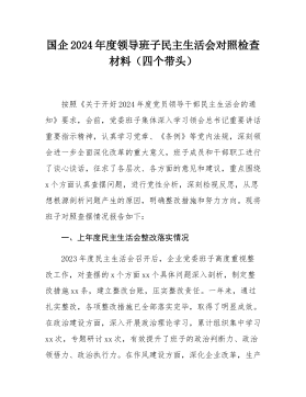县委常委班子2024年度民主生活会"四个带头"对照检查材料按照《关于开好2024年度党员领导干部民主生活会的通知》要求,常委班子会前通过集体学习、个人自学相结合的方式,深入学习习近平总书记重要讲话重要指示精神,系统研读党章、《中国共产党纪律处分条例》等党内法规,深刻领会进一步全面深化改革的重大意义和战略部署,紧密联系工作实际,广泛征求意见、开展谈心谈话,对照5个方面,深入查找班子存在的问题,深刻剖析症结根源,进一步明确了下步努力方向和整改措施。现将班子对照检查情况汇报如下:一、存在问题及具体表现(一)带头严守政治纪律和政治规矩,维护党的团结统一方面。县委常委班子始终不忘共产党员的初心,时刻肩负...