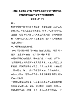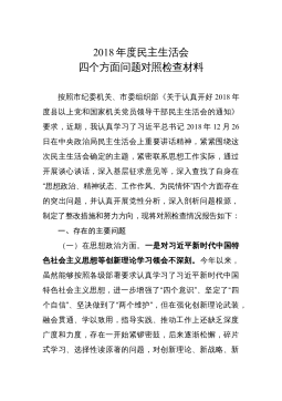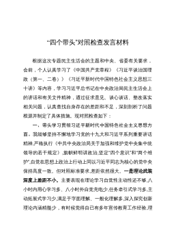 “四个带头”对照检查发言材料根据这次专题民主生活会的主题和中央、省委有关要求,会前,个人认真学习了《中国共产党章程》《习近平谈治国理政(第一、二卷)》《习近平新时代中国特色社会主义思想三十讲》等内容,学习习近平总书记在中央政治局民主生活会上的讲话和有关文件精神,通过征求意见、谈心谈话、整改落实相关问题,认真查找自身存在的差距和不足,深刻剖析了问题根源并制定了具体措施。现对照检查如下:一、带头学习贯彻习近平新时代中国特色社会主义思想方面。我能够坚持不懈地学习党的十九大和习近平系列重要讲话精神,严格执行《中共中央政治局关于加强和维护党中央集中统领导的若干规定》,旗帜鲜明讲政治,坚定“四个意识”和“...