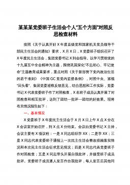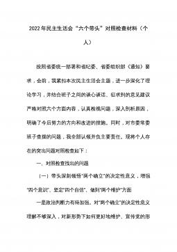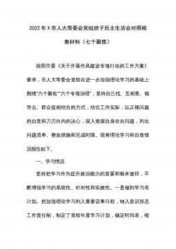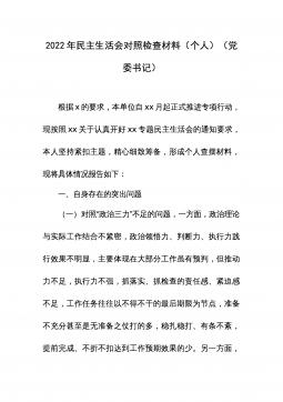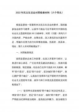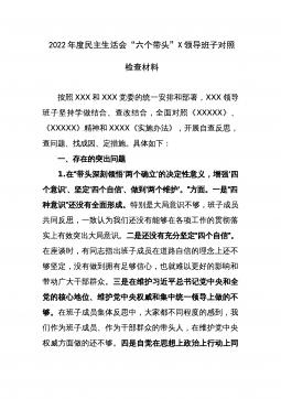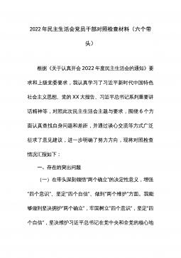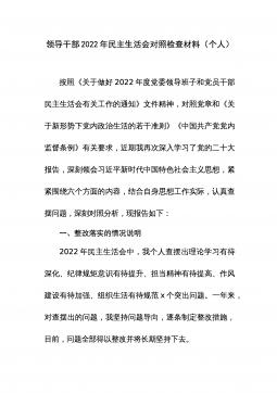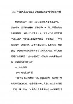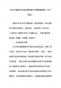 2022年度民主生活会领导班子对照检查材料根据中共xx省(市、县)委组织部《关于认真开好2022年度xx以上党和国家机关党员领导干部民主生活会的通知》精神和要求,xx局党委认真组织学习习近平新时代中国特色社会主义思想、党的二十大会议精神,研读《中国共产党章程(修正案)》和《A谈治国理政》第四卷,为开好民主生活会奠定了坚实的思想基础。紧密班子自身实际,通过书面征集、谈心谈话等方式广泛征求意见建议x余条,在此基础上,围绕六个方面进行对照剖析,查找存在问题,深刻剖析原因,明确改进方向,形成了班子对照检查材料。现将有关情况汇报如下:一、上年度民主生活会整改措施落实情况在2021年度党史学习教育专题民主...