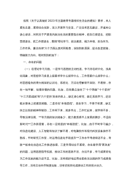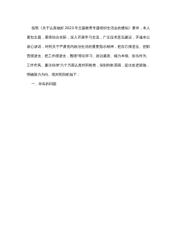 按照《关于认真做好2023年主题教育专题组织生活会的通知》要求,本人紧扣主题,紧密结合实际,深入开展学习交流,广泛征求意见建议,开诚布公谈心谈话,对照关于严肃党内政治生活的重要指示精神,把自己摆进去、把职责摆进去、把工作摆进去,围绕“理论学习、政治素质、能力本领、担当作为、工作作风、廉洁自律”六个方面认真对照检查,深刻剖析原因,提出改进措施,明确努力方向。现对照剖析如下:一、存在的问题(一)在理论学习方面。一是学习思想的主动性差。学习存在碎片化、浅表化现象,对思想学习多是上级要求学什么就学什么,工作需要什么就学什么;对思想蕴含的博大精深的认识论、系统论、方法论理解得不深刻、不透彻,存在一知半解...