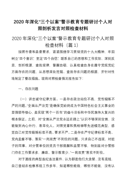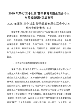 2020年深化“三个以案”警示教育专题生活会个人对照检查研讨发言材料2020年深化“三个以案”警示教育专题生活会个人对照检查研讨材料(1)根据市委、市纪委《关于召开深化“三个以案”警示教育专题生活会》的通知要求,我坚持问题导向,严格标准,严查细对,扎实做好案件剖析、专题研讨、问题查摆等各项工作,由表及里深入思考,由外到内深挖根源,警醒了思想,升华了认识。下面,根据自己的思想、工作、生活实际,从认识和体会、问题和不足、根源和分析、整改措施和下步努力方向四个方面,做个剖析发言,不妥之处敬请同志们批评指正。一、对违纪违法典型案件的认识和体会深化“三个以案”警示教育工作,并结合专项整治扶贫领域形式主义...