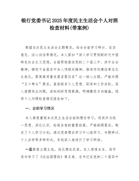 银行分行纪委书记2025年度民主生活会个人对照检查材料(带案例)根据**党委关于召开2025年度民主生活会的统一部署和要求,本人紧扣会议主题,在深入学习党的创新理论、党的二十大及二十届三中、四中全会精神、总书记关于党的自我革命的重要思想以及中央八项规定及其实施细则精神的基础上,紧密结合自身思想、职责和工作实际,严格对照“五个带头”要求,深入查摆突出问题,深刻剖析反面典型案例,认真进行党性分析,明确了今后的努力方向和整改措施。现将个人对照检查情况报告如下。一、对照“五个带头”要求查摆存在的突出问题本人坚持把自己摆进去、把职责摆进去、把工作摆进去,通过群众提、自己找、上级点、互相帮等多种方式,深入查摆自身在思想、政治、作风、能力、廉洁等方面存在的差距和不足,共梳理出以下五个方面15个具体问题。(...