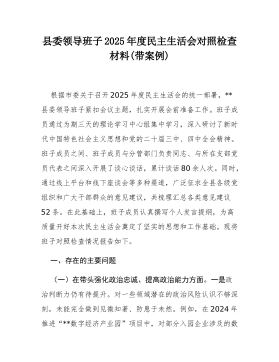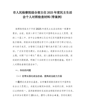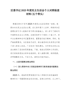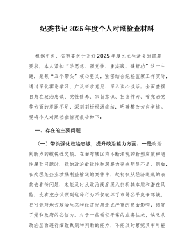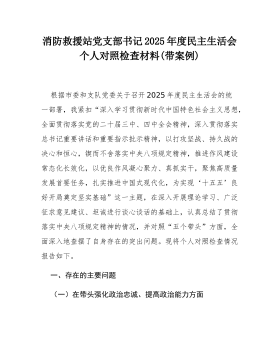 消防救援站党支部书记2025年度民主生活会个人对照检查材料(带案例)根据市委和支队党委关于召开2025年度民主生活会的统一部署,我紧扣“深入学习贯彻新时代中国特色社会主义思想,全面贯彻落实党的二十届三中、四中全会精神,深入贯彻落实总书记重要讲话和重要指示批示精神,以打攻坚战、持久战的决心和恒心,锲而不舍落实中央八项规定精神,推进作风建设常态化长效化,以优良作风凝心聚力、真抓实干,聚焦高质量发展首要任务,扎实推进中国式现代化,为实现‘十五五’良好开局奠定坚实基础”这一主题,在深入开展理论学习、广泛征求意见建议、坦诚进行谈心谈话的基础上,认真总结了贯彻落实中央八项规定精神的情况,并对照“五个带头”方面,全面深入地查摆了自身存在的突出问题。现将个人对照检查情况报告如下。一、存在的主要问题(一)在带...