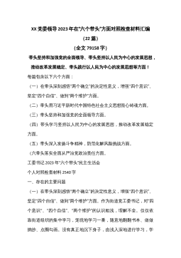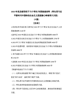 党员领导在2023年度带头坚持和加强党的全面领导等方面“6个带头”对照检查材料汇编(29篇)(全文107746字)目录1.2023年度民主生活会“六个带头”个人对照检查材料3030字2.党支部书记2023年民主生活会“六个带头”对照检查材料3760字3.2023年纪委书记专题民主生活会“六个带头”对照检查材料4170字4.2022年度民主生活会“六个带头”对照检查材料4650字5.2023年副领导民主生活会“六个带头”对照检查材料4680字6.2023年市政府办公室主任民主生活会“六个带头”对照检查材料4770字7.县税务2023年民主生活会“六个带头”对照检查材料6550字8.党组班子202...