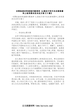 对照检查材料查摆问题清单-认真执行党中央决策部署和上级党委决议决定方面【十篇】对照检查材料查摆问题清单-认真执行党中央决策部署和上级党委决议决定方面1近期,我深入学习了党的十九大报告以及XXX同志在新一届中央政治局民主生活会上的重要讲话,紧紧围绕六个方面的内容,结合自身思想工作实际,认真开展了对照检查,现报告如下,请同志们批评指正。一、存在的主要问题在学习贯彻XXX新时代中国特色社会主义思想,坚决维护习近平同志的核心地位、维护党中央权威和集中统一领导方面:虽然能够牢固树立四个意识,坚定四个自信,做到四个服从,自觉在思想上政治上行动上同以XXX同志为核心的党中央保持高度一致,但对习近平新时代中国...
