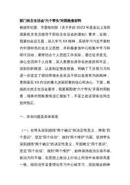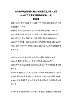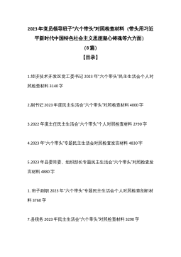 党员领导在2023年度带头坚持和加强党的全面领导等方面“6个带头”对照检查材料汇编(29篇)(全文107746字)目录1.2023年度民主生活会“六个带头”个人对照检查材料3030字2.党支部书记2023年民主生活会“六个带头”对照检查材料3760字3.2023年纪委书记专题民主生活会“六个带头”对照检查材料4170字4.2022年度民主生活会“六个带头”对照检查材料4650字5.2023年副领导民主生活会“六个带头”对照检查材料4680字6.2023年市政府办公室主任民主生活会“六个带头”对照检查材料4770字7.县税务2023年民主生活会“六个带头”对照检查材料6550字8.党组班子202...