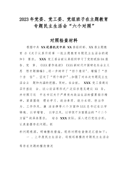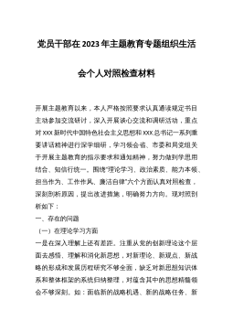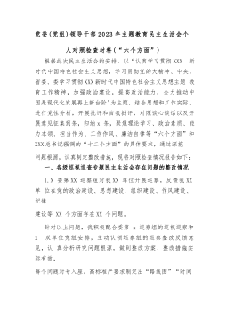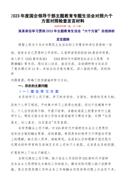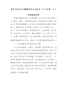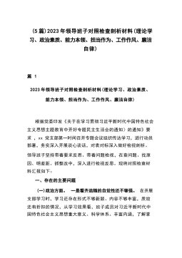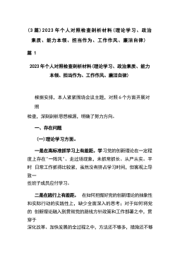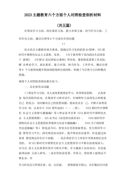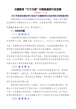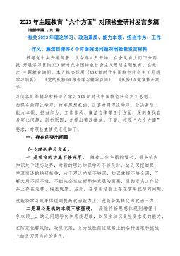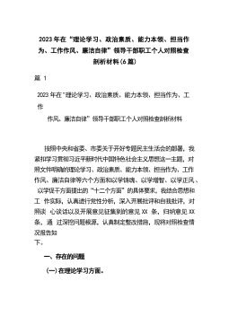 3篇2023年在“理论学习、工作作风、能力本领”六个方面专题个人对照检查剖析材料2023年主题教育专题组织生活会个人对照检查剖析材料(党员干部)根据《XX局基层党组织在学习贯彻习近平新时代中国特色社会主义主题教育中开好专题组织生活会的通知》的要求,本人紧紧围绕主题教育专题组织生活会的主题,深入理论学习,认真开展谈心谈话,对照六个方面,检视差距不足,进行党性分析,抓好问题整改。现做对照检查如下:一、存在问题(一)理论学习方面。一是党的创新理论学习不深刻。往往“学得散”,觉得高深难学,存在畏难情绪,习惯于零敲碎打,东一榔头西一棒子,不认真读原著、学原文、悟原理,碎片化倾向严重,欠缺系统化、全面化、...