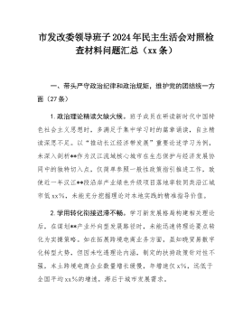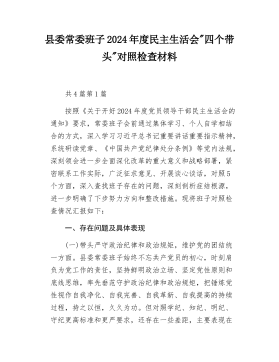 2024年度四个带头民主生活会“带头履行全面从严治党政治责任方面”等四个方面个人对照检查发言材料四篇目录(一)带头严守政治纪律和政治规矩,维护党的团结统一方面。(二)带头增强党性、严守纪律、砥砺作风方面。(三)带头在遵规守纪、清正廉洁前提下勇于担责、敢于创新方面。(四)带头履行全面从严治党政治责任方面。2024年度民主生活会“四个带头”对照检查发言材料根据市纪委、市委组织部关于召开2024年度民主生活会的通知要求,我紧紧围绕这次民主生活会主题,重温党章党规,认真研读《中国共产党纪律处分条例》《中共中央办公厅关于推进党纪学习教育常态化长效化的意见》等重要文件,深入学习习近平新时代中国特色社会主义...