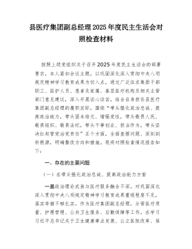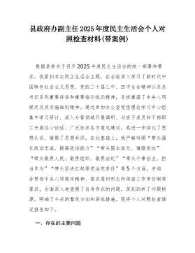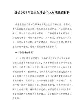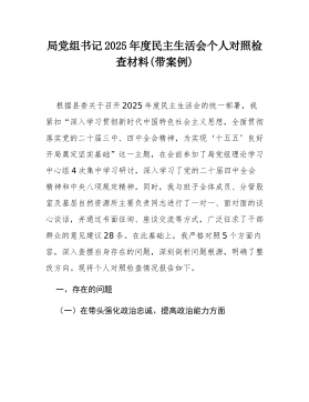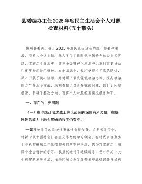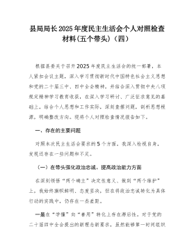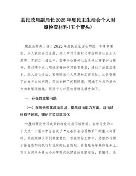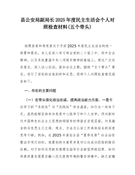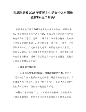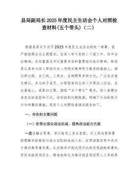 县局副局长2025年度民主生活会个人对照检查材料(五个带头)(二)根据县委关于召开2025年度民主生活会的统一部署,我严格按照会议主题要求,在深入学习党的二十届三中、四中全会精神,系统重温总书记重要讲话和重要指示批示精神,特别是认真参与深入贯彻中央八项规定精神学习教育的基础上,通过群众提、自己找、上级点、互相帮等多种方式,广泛征求意见建议,并与班子成员、分管股室同志深入开展谈心谈话。在此基础上,我紧扣主题,围绕“五个带头”要求,深入查摆自身存在的差距和不足,深刻剖析问题根源,明确了今后的努力方向和整改措施。现将个人对照检查情况报告如下。一、存在的主要问题(一)在带头强化政治忠诚、提高政治能力方面一是在融会贯通、学以致用上存在差距,对上级决策部署的理解未能做到与地方实际的丝丝入扣。在贯彻落实党...