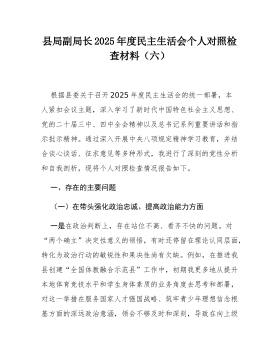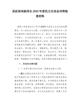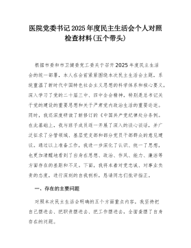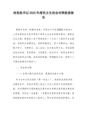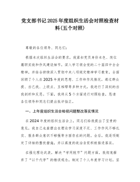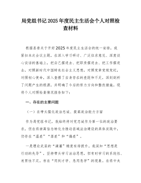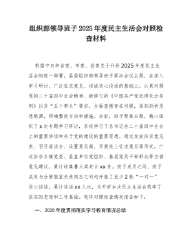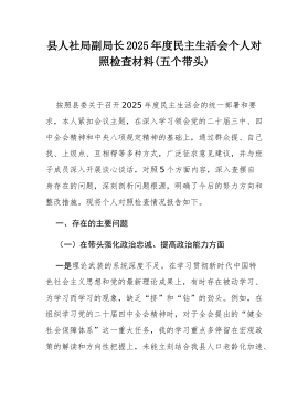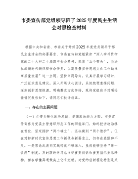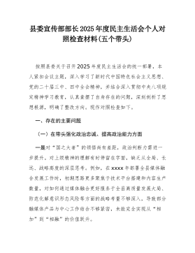 园区服务中心领导班子2025年度民主生活会对照检查材料(五个带头)根据市委关于召开2025年度民主生活会的统一部署,会前,班子成员通过党组理论学习中心组集中学习、个人自学等方式,深入研读了党的二十大报告、党章,认真学习了总书记关于党的建设的重要思想、关于严肃党内政治生活的重要论述,特别是系统学习了党的二十届三中、四中全会精神和中央八项规定精神学习教育相关文件。为广泛听取意见,班子成员通过发放征求意见函、召开座谈会、个别访谈等形式,面向园区18家重点企业、32名基层党员干部群众,共征集到涉及产业发展、作风建设、服务效能等方面的意见建议27条。班子主要负责同志与班子成员、班子成员相互之间、班子成员与分管部门主要负责同志及所在党支部党员代表深入开展了谈心谈话,累计谈话30余人次,做到了把问题谈开、...