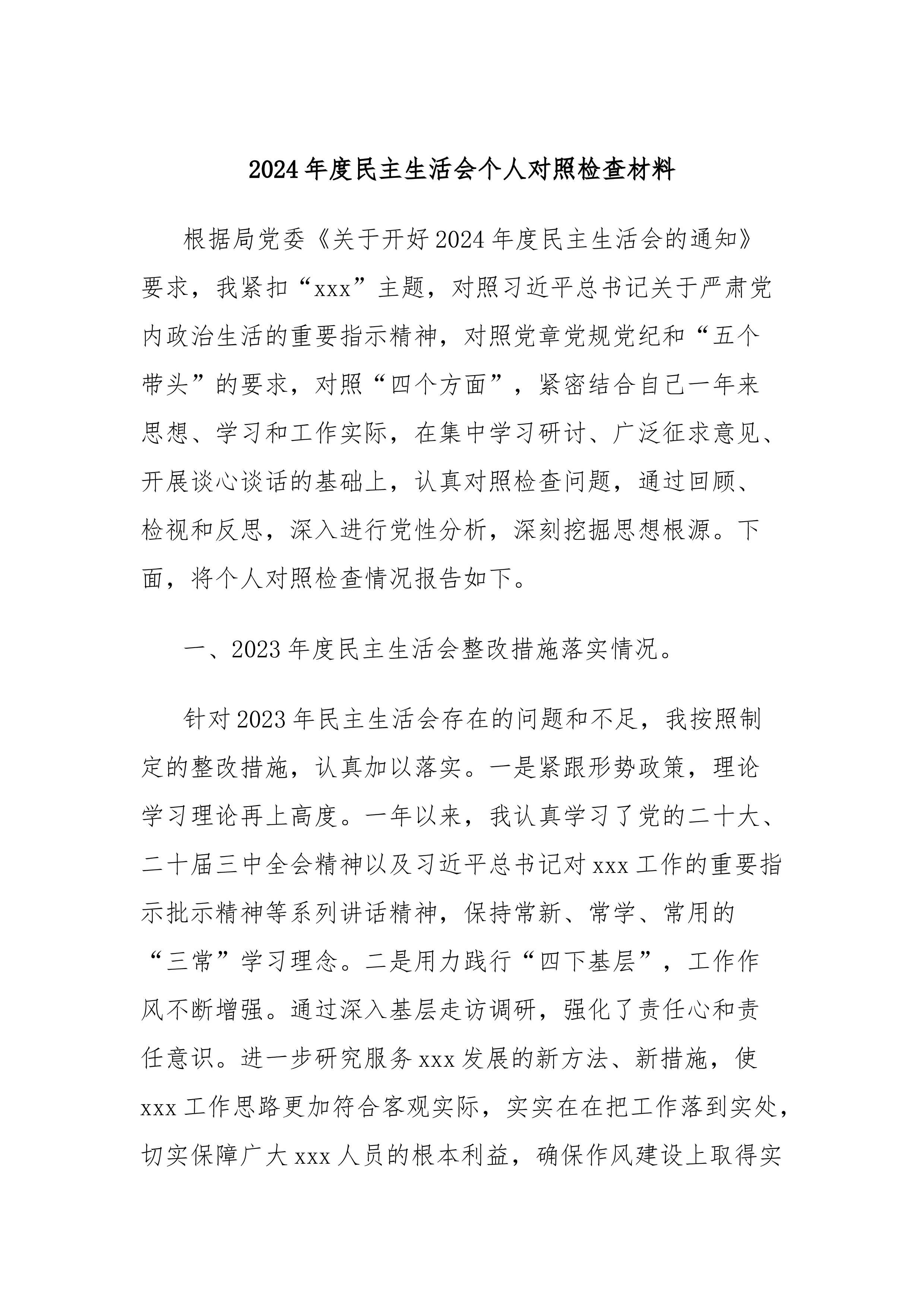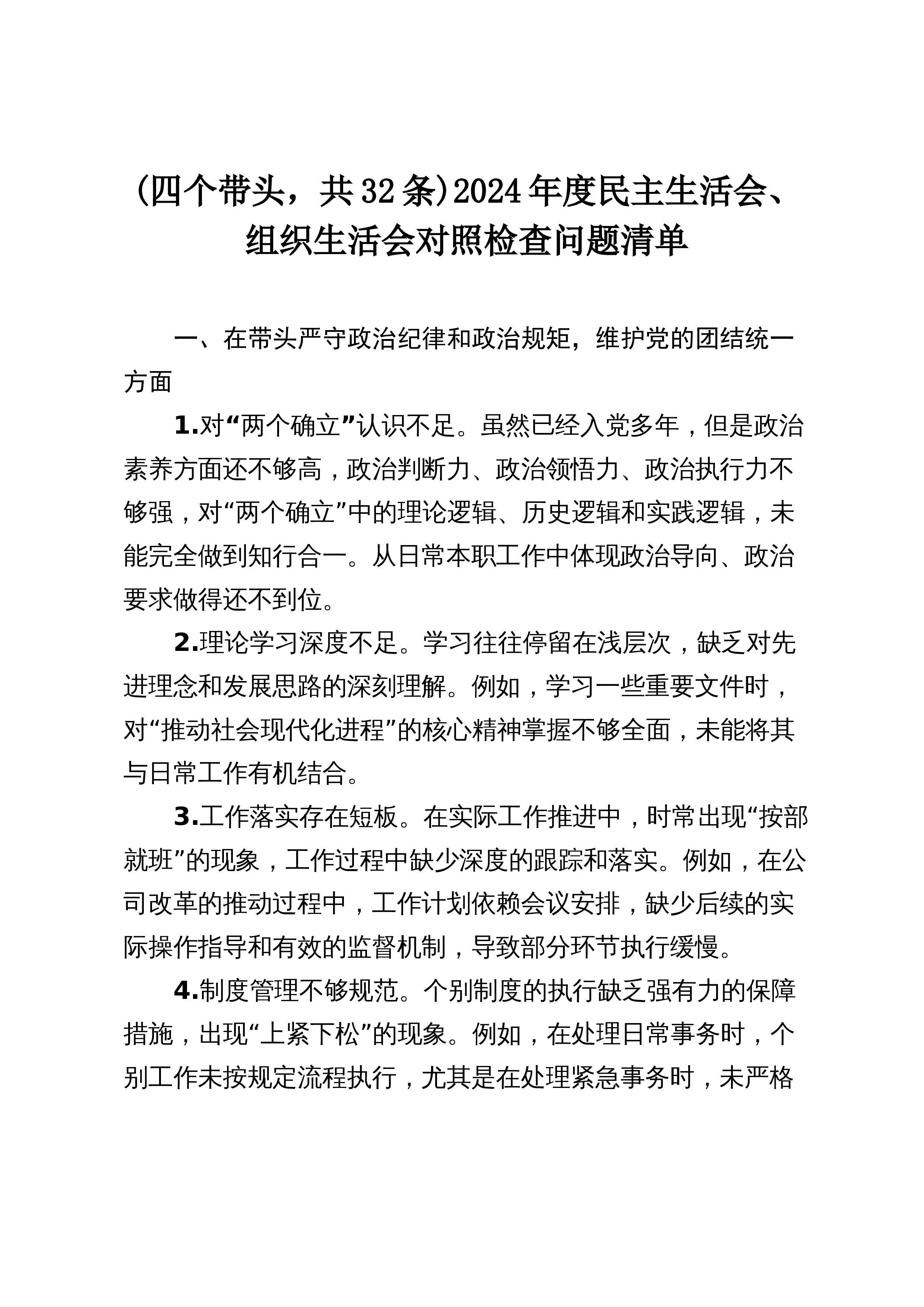 2023“”年全面围绕六个方面组织生活会个人对照检查材料1.深刻领悟"两个确立"的决定性意义、坚决做到"两个维护"方面2.学懂弄通做实领袖新时代中国特色社会主义思想方面3.牢记国之大者、对党忠诚、为党分忧、为党尽责、为党奉献,4.坚持人民至上、解决群众急难愁盼问题方面5.发扬斗争精神、勇于担当作为方面6.克服形式主义、官僚主义方面【正文】作为XX“”人大机关一名党员干部,自己能牢固树立四个意识、坚定"四个自信",做到"两个维护",能够始终同以领袖同志为核心的党中央保持高度一致,但对照党中央和领袖总书记的号召和要求,个人还有很多问题和不足。“”一是对两个确立的内涵领悟不够。对"两”个确立丰富的内...