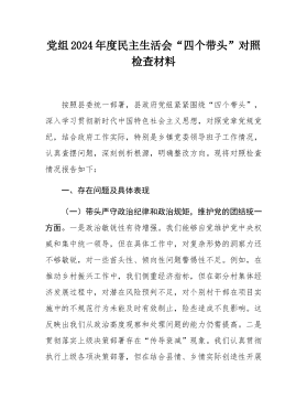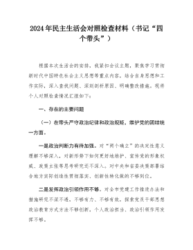 2024年度县司法局一把手专题民主生活会对照检查材料(对照“x个带头”+反面案例)根据《2024年度乡镇和县机关单位党组(党委)民主生活会实施方案》要求,我深入学习了新时代中国特色社会主义思想、党的二十届三种全会精神,围绕方案要求的“x个带头”进行全面对照检查,深入剖析自身存在的不足,认真查找问题原因,科学制定整改举措。现将对照检查情况报告如下。一、上年度民主生活会问题整改情况在上年度的民主生活会中,本人对查摆出x个方面问题,目前已全部整改到位。针对学习方法不够有效问题。通过“三会一课”、专题宣讲、全员政治轮训、浙里干部之家等载体,发挥好自身领导干部领学、促学作用,带领全系统党员干部深入学习新...