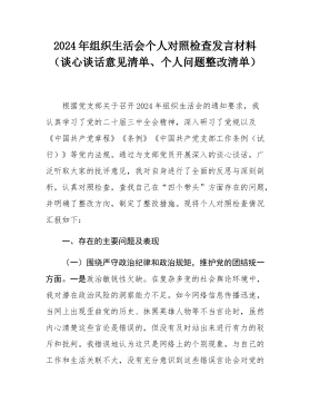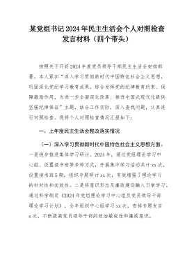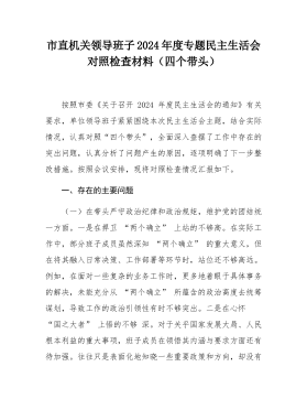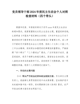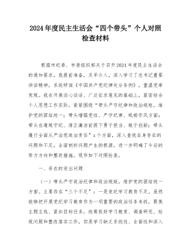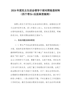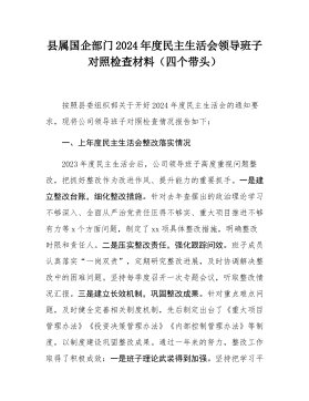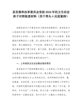县发展和改革委员会党组2024年民主生活会班子对照检查材料(四个带头+反面案例)按照县委关于开展党纪学习教育的部署要求,委党组班子认真组织开展了党纪学习教育,深入学习新修订的《中国共产党纪律处分条例》,全面对照党的二十届三中全会精神,紧紧围绕纪律建设这个主题,深入查找在带头严守政治纪律和政治规矩、带头增强党性、严守纪律、砥砺作风、带头在遵规守纪、清正廉洁前提下勇于担责、敢于创新、带头履行全面从严治党政治责任等方面存在的问题和不足,并对照反面典型案例深刻汲取教训。现将对照检查情况报告如下。一、上年度民主生活会整改落实情况委党组班子严格按照整改要求,认真落实上年度民主生活会查摆出的各类问题的整改工...