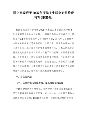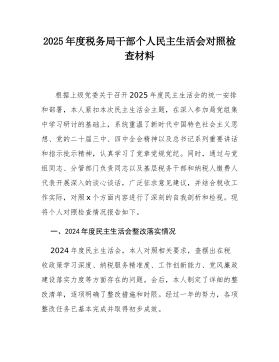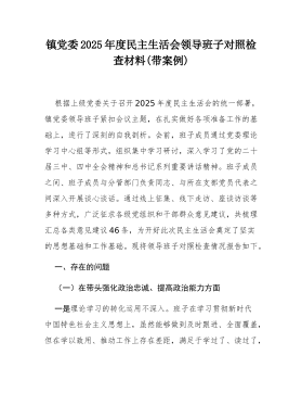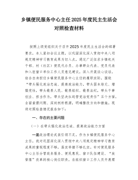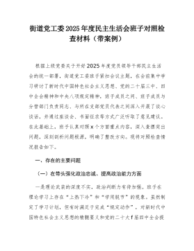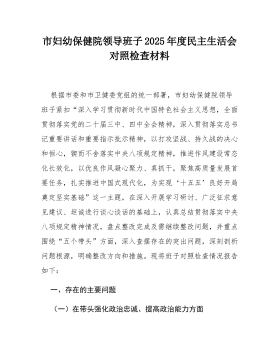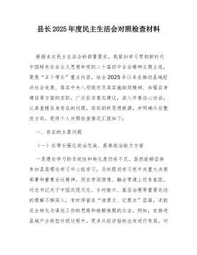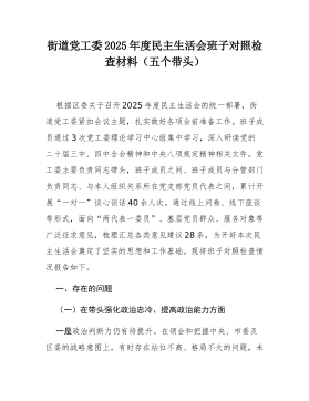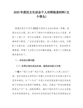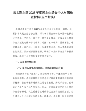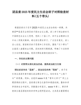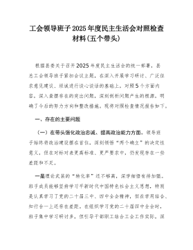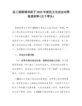 县工商联领导班子2025年度民主生活会对照检查材料(五个带头)根据县委关于召开2025年度民主生活会的统一部署,**县工商业联合会领导班子紧扣会议主题,在深入开展学习研讨、广泛征求意见建议、坦诚进行谈心谈话的基础上,全面总结贯彻落实中央八项规定精神情况,对照5个方面内容,深入查摆了存在的突出问题,深刻剖析了问题产生的根源,并明确了下一步的整改方向和措施。现将对照检查情况报告如下。一、存在的主要问题(一)在带头强化政治忠诚、提高政治能力方面。班子能够深刻领悟“两个确立”的决定性意义,但在将政治判断力、政治领悟力、政治执行力贯穿于服务“两个健康”全过程的实践中,仍存在一些差距和不足。一是谋划工作缺少政治站位的高度。在贯彻上级决策部署时,有时更多地从工商联业务职能角度思考,对标党中央关于经济工作的...