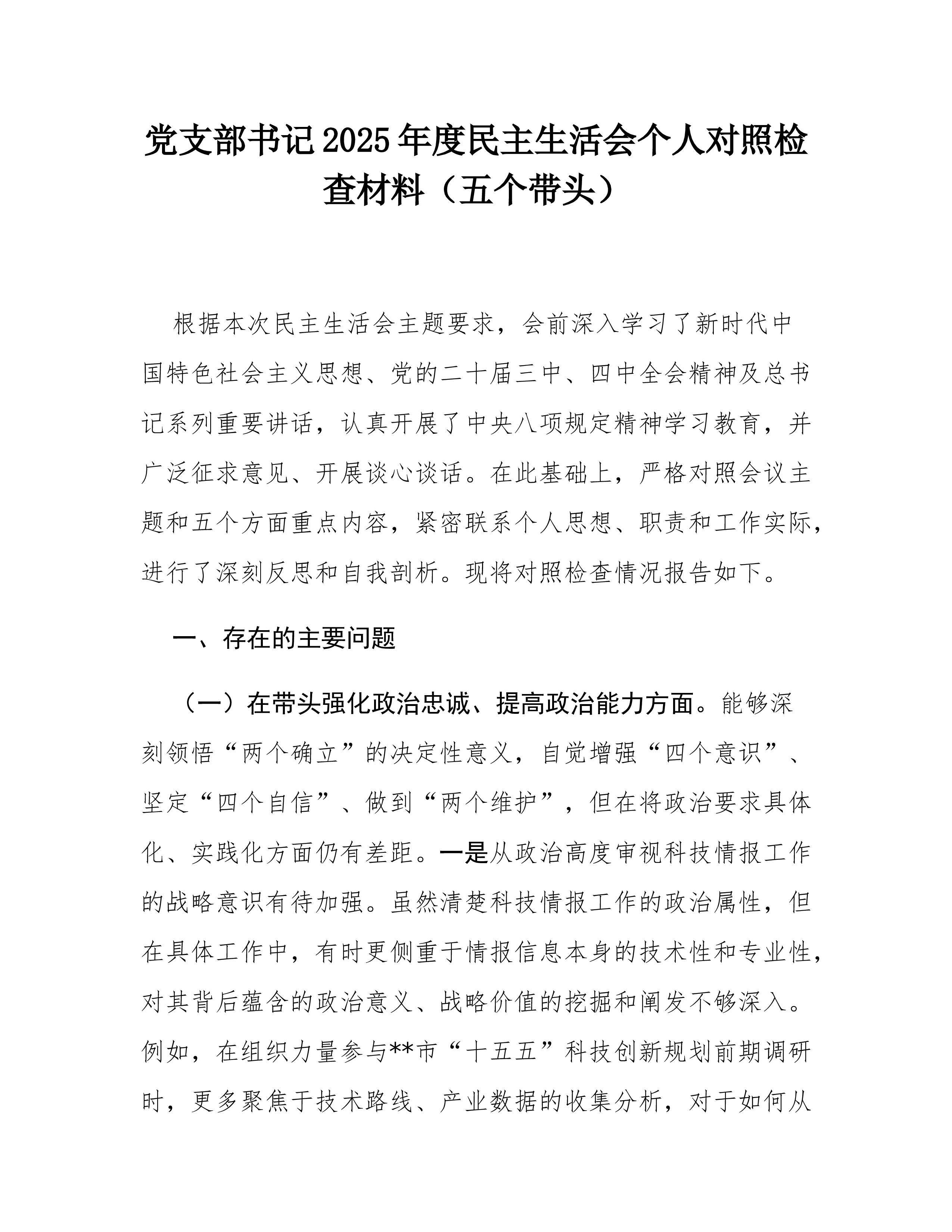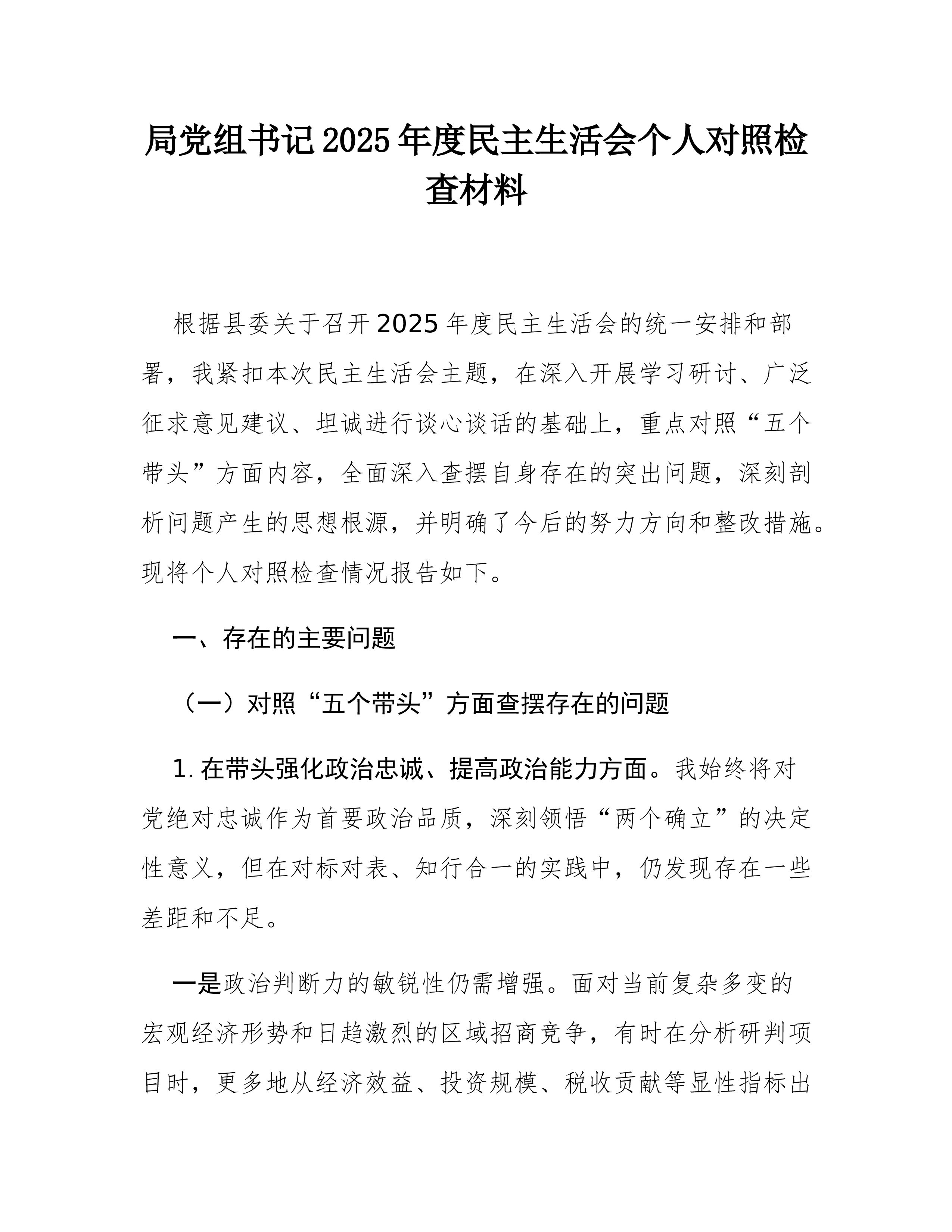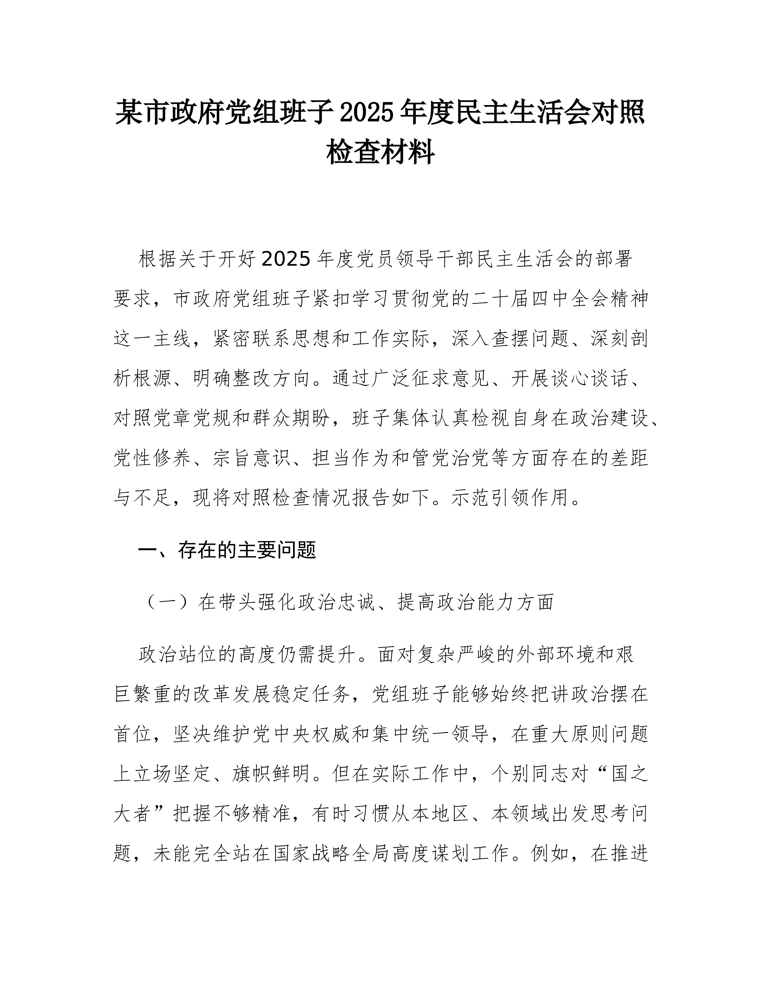 市应急管理局党委书记2025年度民主生活会上的个人对照检查材料根据市委关于召开2025年度民主生活会的统一部署和局党委的具体安排,我紧扣本次民主生活会主题,在深入开展学习研讨、广泛征求意见建议、坦诚进行谈心谈话的基础上,对照“五个带头”的具体要求,结合思想和工作实际,全面深入地查摆了自身存在的问题,深刻剖析了问题产生的根源,并明确了今后的努力方向和整改措施。现将个人对照检查情况报告如下。一、存在的主要问题(一)对照“五个带头”方面查摆存在的问题一是在带头强化政治忠诚、提高政治能力方面1.理论学习成果向实践效能的转化还不够高效。我始终坚持将学习贯彻新时代中国特色社会主义思想作为首要政治任务,但有时在学用结合上还存在“温差”。面对应急管理工作“全灾种、大应急”的新形势新要求,如何将党的创新理论中...