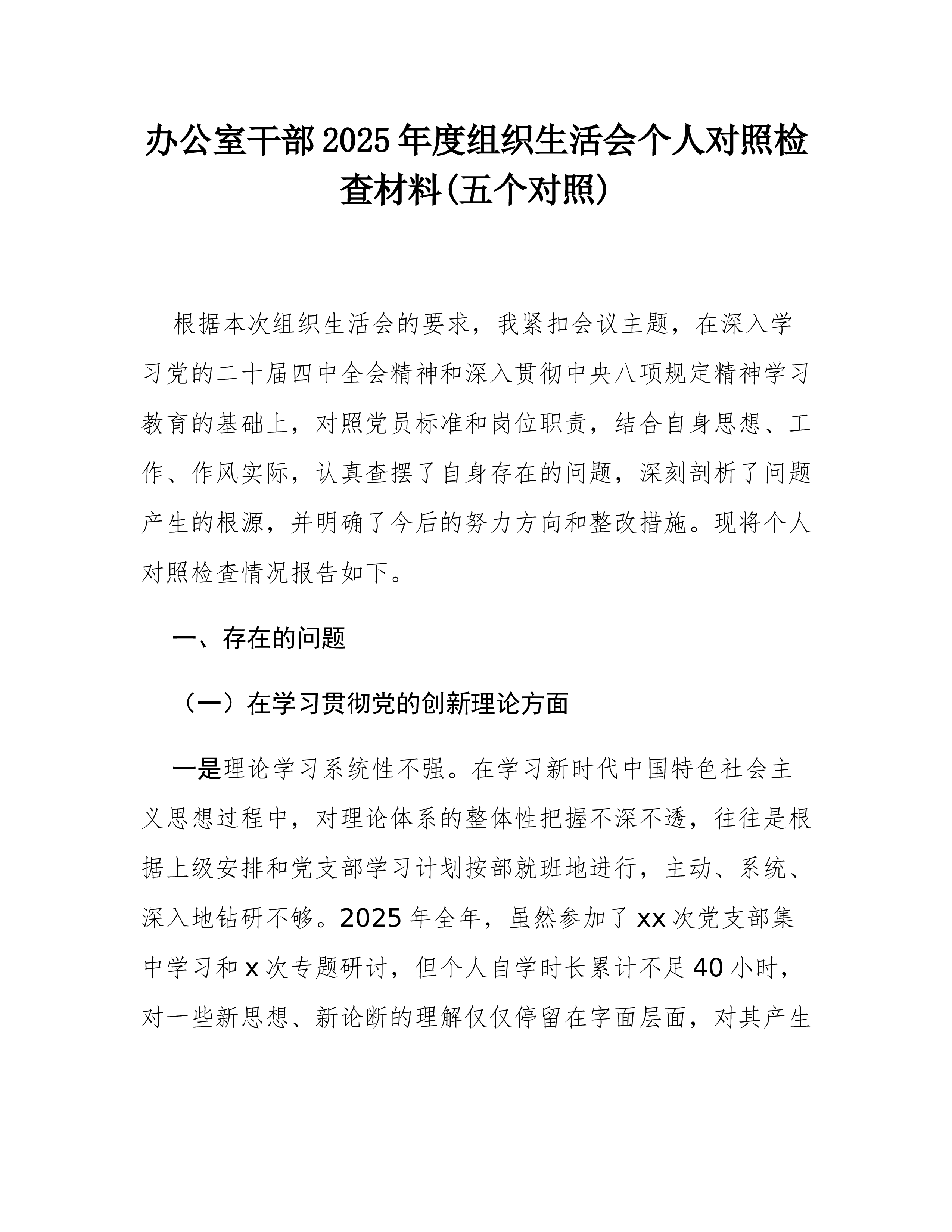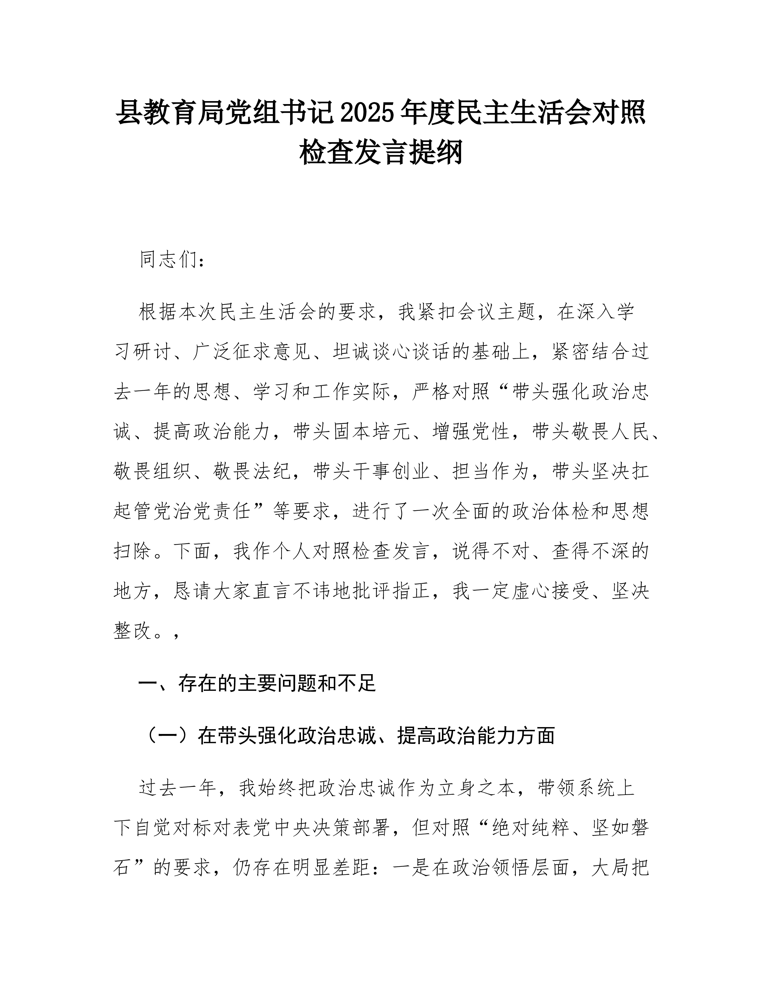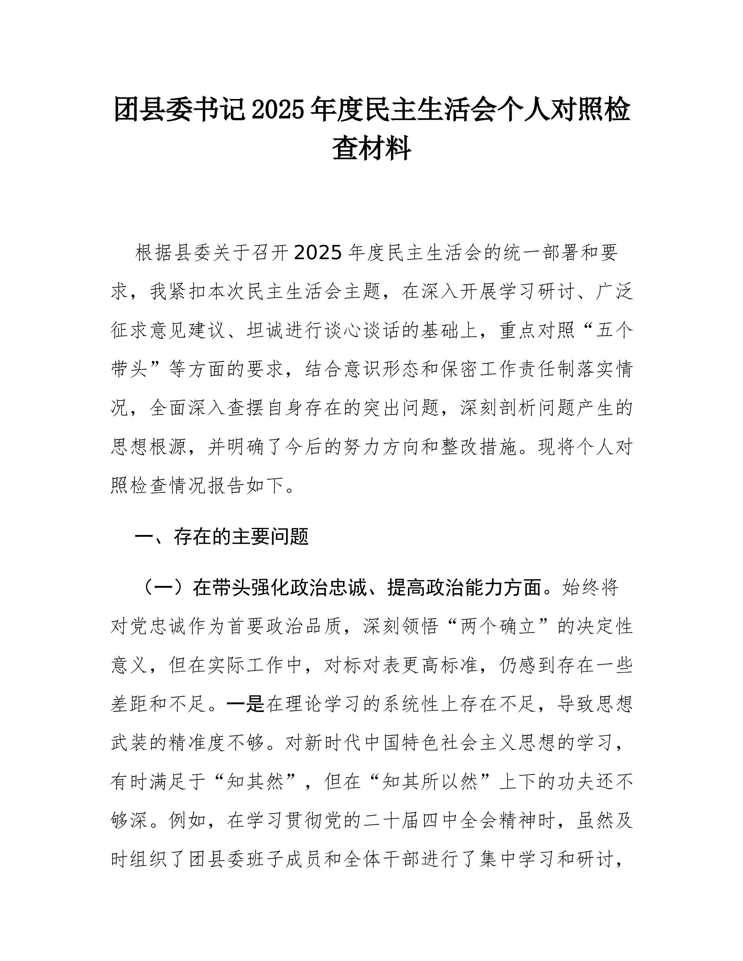 市应急管理局党委书记2025年度民主生活会上的个人对照检查材料根据市委关于召开2025年度民主生活会的统一部署和局党委的具体安排,我紧扣本次民主生活会主题,在深入开展学习研讨、广泛征求意见建议、坦诚进行谈心谈话的基础上,对照“五个带头”的具体要求,结合思想和工作实际,全面深入地查摆了自身存在的问题,深刻剖析了问题产生的根源,并明确了今后的努力方向和整改措施。现将个人对照检查情况报告如下。一、存在的主要问题(一)对照“五个带头”方面查摆存在的问题一是在带头强化政治忠诚、提高政治能力方面1.理论学习成果向实践效能的转化还不够高效。我始终坚持将学习贯彻新时代中国特色社会主义思想作为首要政治任务,但有时在学用结合上还存在“温差”。面对应急管理工作“全灾种、大应急”的新形势新要求,如何将党的创新理论中...