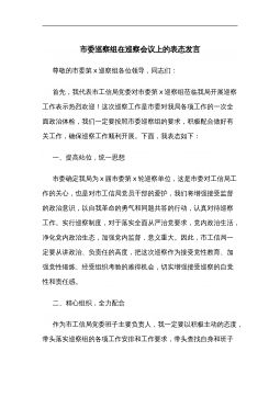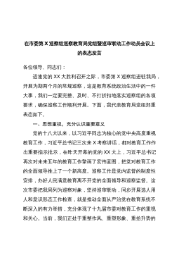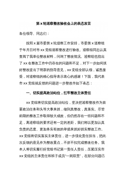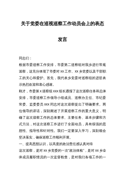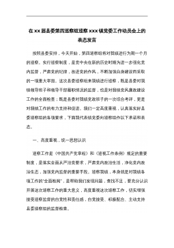 在xx届县委第四巡察组巡察xxx镇党委工作动员会上的表态发言按照县委安排,今天开始,第四巡察组将对我镇进行为期一个月的巡察。实行巡察制度,是党中央在新的历史时期为进一步强化党内监督,严肃党的纪律,改进党的作风,不断加强自身建设而采取的一项重大举措。这次县委巡察组来我镇进行巡察,既是县委对我镇领导班子和领导干部履职情况的监督,也是对我镇党风廉政建设工作的全面检查;既是县委对我镇党政班子的一次综合考评,更是对我镇工作的有力支持和促进。我们一定高度重视,认真落实好县委巡察组的各项要求,下面我代表镇党委向巡察组作以下承诺和表态。一、高度重视,统一思想认识巡察工作是《中国共产党章程》和《巡视工作条例》规...