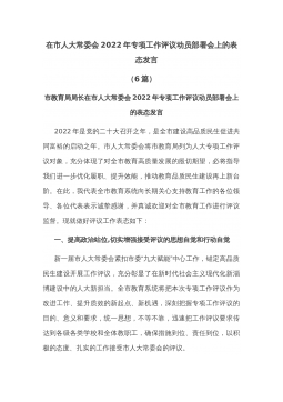 在市人大常委会2022年专项工作评议动员部署会上的表态发言(6篇)市教育局局长在市人大常委会2022年专项工作评议动员部署会上的表态发言2022年是党的二十大召开之年,是全市建设高品质民生促进共同富裕的启动之年。市人大常委会将市教育局列为人大专项工作评议对象,充分体现了对全市教育高质量发展的殷切期望,必将指导我们进一步优化履职、提升效能,推动教育品质民生建设再上新台阶。在此,我代表全市教育系统向长期关心支持教育工作的各位领导、各位代表表示诚挚感谢,并真诚欢迎对全市教育工作进行评议监督。现就做好评议工作表态如下:一、提高政治站位,切实增强接受评议的思想自觉和行动自觉新一届市人大常委会紧扣市委“九...