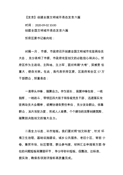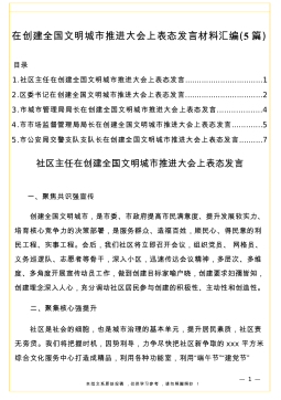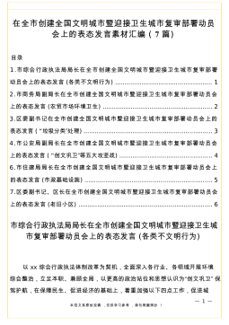 在全市创建全国文明城市暨迎接卫生城市复审部署动员会上的表态发言素材汇编(7篇)目录1.市综合行政执法局局长在全市创建全国文明城市暨迎接卫生城市复审部署动员会上的表态发言(各类不文明行为)...................................................12.市商务局副局长在全市创建全国文明城市暨迎接卫生城市复审部署动员会上的表态发言(农贸市场环境卫生)..........................................................23.区委副书记在全市创建全国文明城市暨迎接卫生城市复审部署动员会上的表态发言(“垃圾分类”处...
