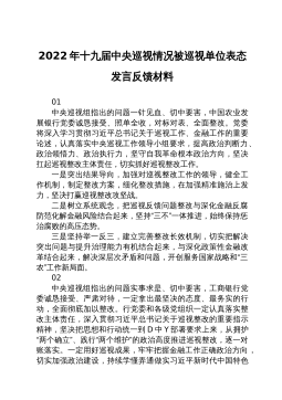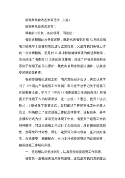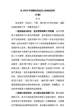 在2023年巡察动员会议上的表态发言(4篇)(一)各位领导,同志们:下面,我代表XX单位党组,就配合做好巡察工作,郑重表态如下:一是提高政治站位,坚决贯彻巡察工作部署。这次市委第X巡察组到XX单位开展巡察,是市委坚定不移推进全面从严治党的体现,也是市委对XX工作的一次全方位的“政治体检”,这充分体现了市委对XX工作的高度重视和对XX事业发展的关心支持。通过巡察组的监督检查和指导,有利于我们更好地学习贯彻习近平新时代中国特色社会主义思想和党的二十大精神,更加扎实有效地执行党中央和省市委的重大决策部署;有利于我们扎实贯彻全面从严治党和党风廉政建设要求,落实“两个责任”,深化“一岗双责”,大力弘扬学...