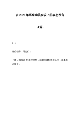 在2023年巡察动员会议上的表态发言(4篇)(一)各位领导,同志们:下面,我代表XX单位党组,就配合做好巡察工作,郑重表态如下:一是提高政治站位,坚决贯彻巡察工作部署。这次市委第X巡察组到XX单位开展巡察,是市委坚定不移推进全面从严治党的体现,也是市委对XX工作的一次全方位的“政治体检”,这充分体现了市委对XX工作的高度重视和对XX事业发展的关心支持。通过巡察组的监督检查和指导,有利于我们更好地学习贯彻习近平新时代中国特色社会主义思想和党的二十大精神,更加扎实有效地执行党中央和省市委的重大决策部署;有利于我们扎实贯彻全面从严治党和党风廉政建设要求,落实“两个责任”,深化“一岗双责”,大力弘扬学...