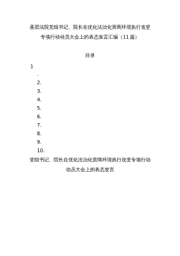 基层法院党组书记、院长在优化法治化营商环境执行攻坚专项行动动员大会上的表态发言汇编(11篇)目录1.2.3.4.5.6.7.8.9.10.党组书记、院长在优化法治化营商环境执行攻坚专项行动动员大会上的表态发言一、深化思想认识,强化组织领导。牢固树立“法治是最好的营商环境”理念,深刻认识做好优化法治化营商环境的重大意义,进一步增强责任感和使命感,切实把搞好“优化法治化营商环境执行攻坚”专项行动作为法院学习贯彻党的二十大精神,推进法院工作现代化的具体举措。加强组织领导,成立领导小组和专班,认真贯彻落实省高院开展难案攻坚、“xx2023”执行专项行动和市中院“优化法治化营商环境执行攻坚”专项行动的安...