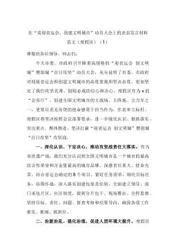 在“喜迎省运会,创建文明城市”动员大会上的表态发言材料范文(度假区)(1)尊敬的各位领导、同志们:今天市委、市政府召开隆重高规格的“迎省运会创文明城”暨创城“百日攻坚”动员大会,充分说明了市委、市政府对迎接省运会和创建文明城市的高度重视和坚决态度,更加坚定了我们攻坚克难、创则必成的信心和决心。度假区作为x的“会客厅”,创建全国文明城市的主战场、主阵地、主力军之一,更要以责无旁贷的使命感勇于担当作为,作表率立标杆。度假区将坚决按照会议部署要求,进一步强化认识、狠抓落实、突出重点、整体推进,坚决打赢“迎省运会创文明城”暨创城“百日攻坚”攻坚战。一、深化认识、下定决心,推动攻坚战责任大落实。作为双世...
