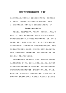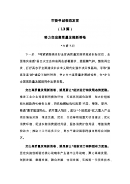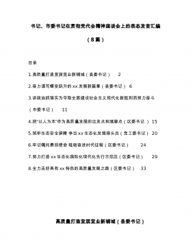 书记、市委书记在贯彻党代会精神座谈会上的表态发言汇编(8篇)目录1.高质量打造宜居宜业新辅城(县委书记)22.奋力谱写蝶变跃升的xx发展新篇章(县委书记)63.讲政治抓落实为夺取全面建设社会主义现代化新胜利而努力奋斗(市委书记)114.把“以人为本”作为高质量发展的出发点和落脚点(区委书记)155.筑牢生态安全屏障争当xx生态化发展排头兵(党工委书记)206.牢记嘱托勇担使命砥砺奋进时代征程(区委书记)247.努力打造xx生态化国际化现代化先行示范区(区委书记)298.全力走好具有xx特色的高质量发展之路(区委书记)33高质量打造宜居宜业新辅城(县委书记)市第十二次党代会,是在我们处于“两个大...