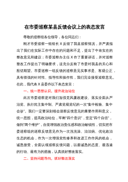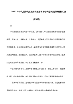 2022年十九届中央巡视情况被巡视单位表态发言反馈材料汇编(25组)01中央巡视组指出的问题一针见血、切中要害,中国农业发展银行党委诚恳接受、照单全收,对标对表、全面整改。党委将深入学习贯彻习近平总书记关于巡视工作、金融工作的重要论述,认真落实中央巡视工作领导小组要求,提高政治判断力、政治领悟力、政治执行力,坚守自我革命根本政治方向,坚决扛起巡视整改主体责任,切实抓好巡视整改工作。一是突出结果导向,加强对巡视整改工作的领导,健全工作机制,制定整改方案,细化整改措施,在加强精准施治上发力,坚决打赢巡视整改攻坚战。二是树立系统观念,把巡视反馈问题整改与深化金融反腐、防范化解金融风险结合起来,坚持“...