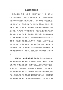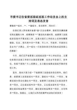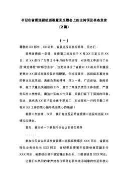书记在省委巡视组巡视意见反馈会上的主持词及表态发言(2篇)(一)尊敬的XX部长,XX组长,省委巡视组各位领导,同志们:按照省委统一安排,省委第二巡视组于X月XX日至X月XX日,对XX进行了为期2个半月的专项巡视,对各项工作进行了全面“政治体检”和“综合会诊”,这充分体现了省委对XX的关怀和重视,更是对XX建设发展的促进和鞭策。在巡视期间,巡视组本着对党的事业无比忠诚、高度负责的精神,深入一线、广泛谈话、查阅资料,做了大量扎实细致的工作,展示了高度负责的工作态度、严谨务实的工作作风、廉洁朴实的工作风貌,给我们留下了深刻的印象。在此,我代表XX班子及全体干部员工,对巡视组一行的辛勤工作和对XX工作...