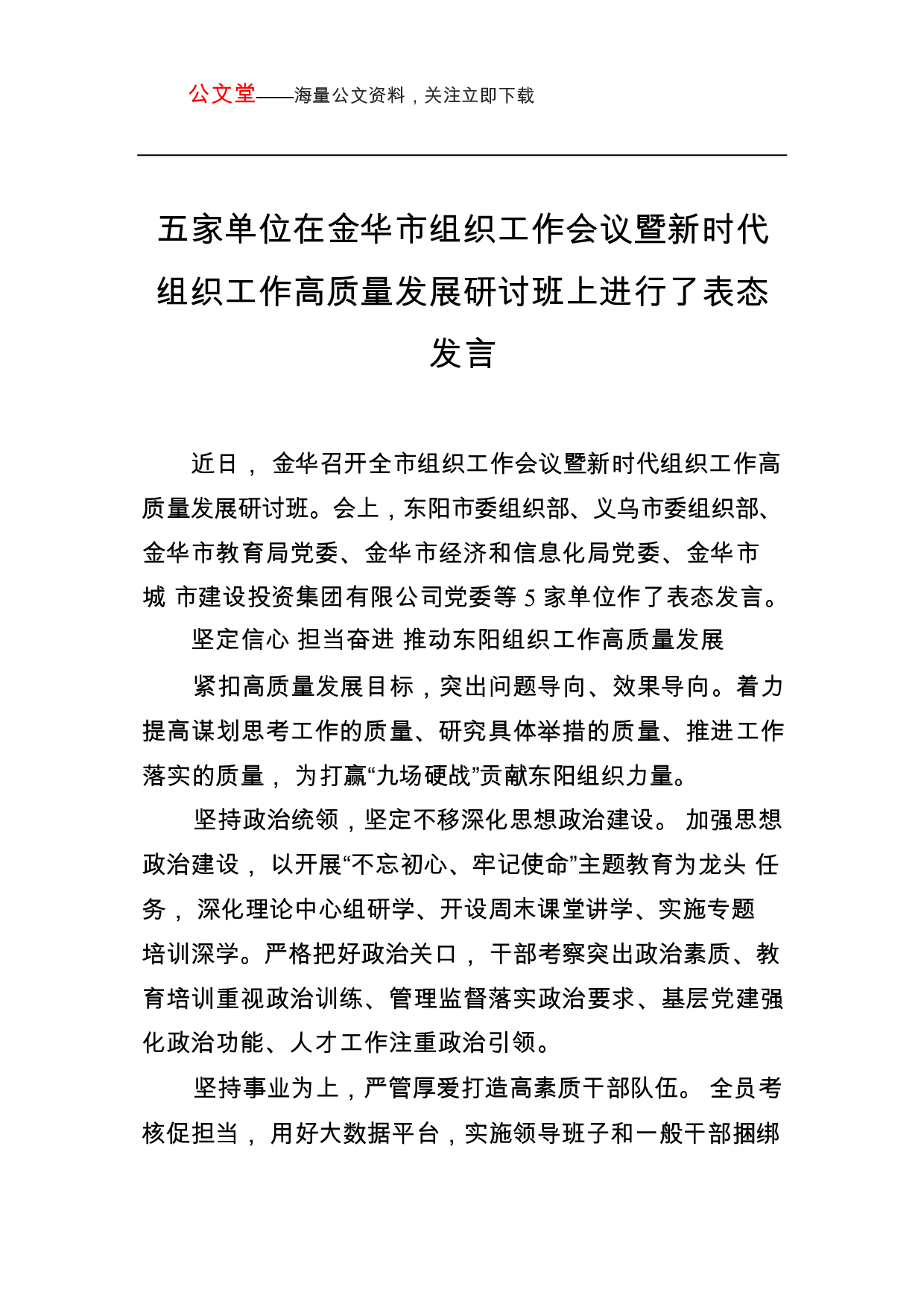 五家单位在金华市组织工作会议暨新时代组织工作高质量发展研讨班上进行了表态发言
