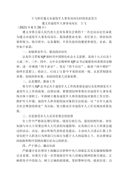 王飞担任遵义市退役军人事务局局长时的表态发言遵义市退役军人事务局局长王飞(2021年6月26日)遵义市第五届人民代表大会常务委员会第四十一次会议决定任命我为遵义市退役军人事务局局长。我深感使命光荣,责任重大,将倍加珍惜和努力,恪尽职守,认真履职,不辜负组织的期望和重托。在此,我作如下承诺:一、加强理论学习,提高政治站位认真学习贯彻XJP新时代中国特色社会主义思想、党的十九大以及十九届二中、三中、四中、五中全会精神和XJP总书记视察贵州重要讲话精神,进一步增强“四个意识”,坚定“四个自信”,做到“两个维护”始终在思想上、政治上、行动上与D中Y保持高度一致,认真贯彻落实省委、省政府和市委、市政府的...