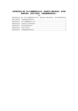 任职表态发言5篇(县卫生健康委员会主任、县退役军人事务局局长、县应急管理局局长、县审计局局长、市场监督管理局局长)目录任职表态发言5篇(县卫生健康委员会主任、县退役军人事务局局长、县应急管理局局长、县审计局局长、市场监督管理局局长).........................................................................................1任职表态发言(县卫生健康委员会主任)...............................................................................