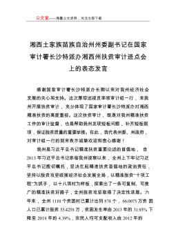 公文堂——海量公文资料,关注立即下载湘西土家族苗族自治州州委副书记在国家审计署长沙特派办湘西州扶贫审计进点会上的表态发言感谢国家审计署长沙特派办长期以来对我州经济社会发展的关心和支持。这次厚琼巡视员率领审计组一行,来我州开展扶贫审计,充分体现了国家审计署长沙特派办对湘西精准扶贫的高度重视。这次扶贫审计,既是对我州精准扶贫工作的审计监督,也是帮助我州发现短板问题,补齐短板弱项,保证脱贫质量的重要举措。在此,我代表州委、州政府,对审计组一行的到来表示诚挚欢迎和衷心感谢!我州是习近平总书记精准扶贫重要论述的首倡地,自2013年习近平总书记亲临我州视察以来,全州上下牢记习近平总书记殷切嘱托,坚决扛起精...