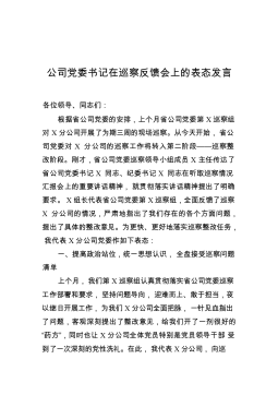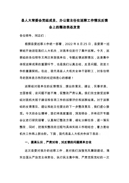 县人大常委会党组成员、办公室主任在巡察工作情况反馈会上的整改表态发言各位领导、同志们:根据县委巡察工作统一部署,2022年8月25日,县委第一巡察组开始进驻我们人大机关,对我单位进行了集中巡察。今天,巡察组的各位领导又再次来到我单位,专题反馈巡察情况,这是集中体现巡察成果的重要环节,也是我们认真总结、反思问题、改进工作的重要契机。在此,我代表县人大机关全体干部职工,对各位领导的到来表示热烈的欢迎和衷心的感谢!巡察组对我单位的反馈情况,提出的意见、建议,实事求是、全面客观,谈问题不遮不掩,促整改严肃认真。我们完全接受巡察组对我机关班子建设和各项工作的巡察评价和巡察结果。对于巡察组的反馈意见、建议...